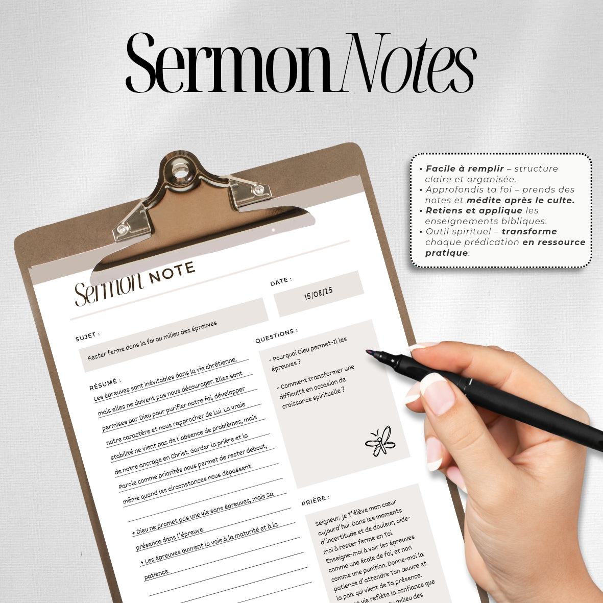 Le Sermon de Notes est conçu pour vous accompagner dans vos moments de culte ou d’étude biblique. Grâce à ce fichier digital :